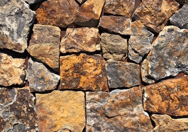 The bold color palette—rich rust, deep brown, and striking blue-gray—adds warmth and energy to any surface. Whether used on exterior walls, fireplaces, or garden features, Sunset brings a lively, rustic charm that feels both natural and artfully intentional.